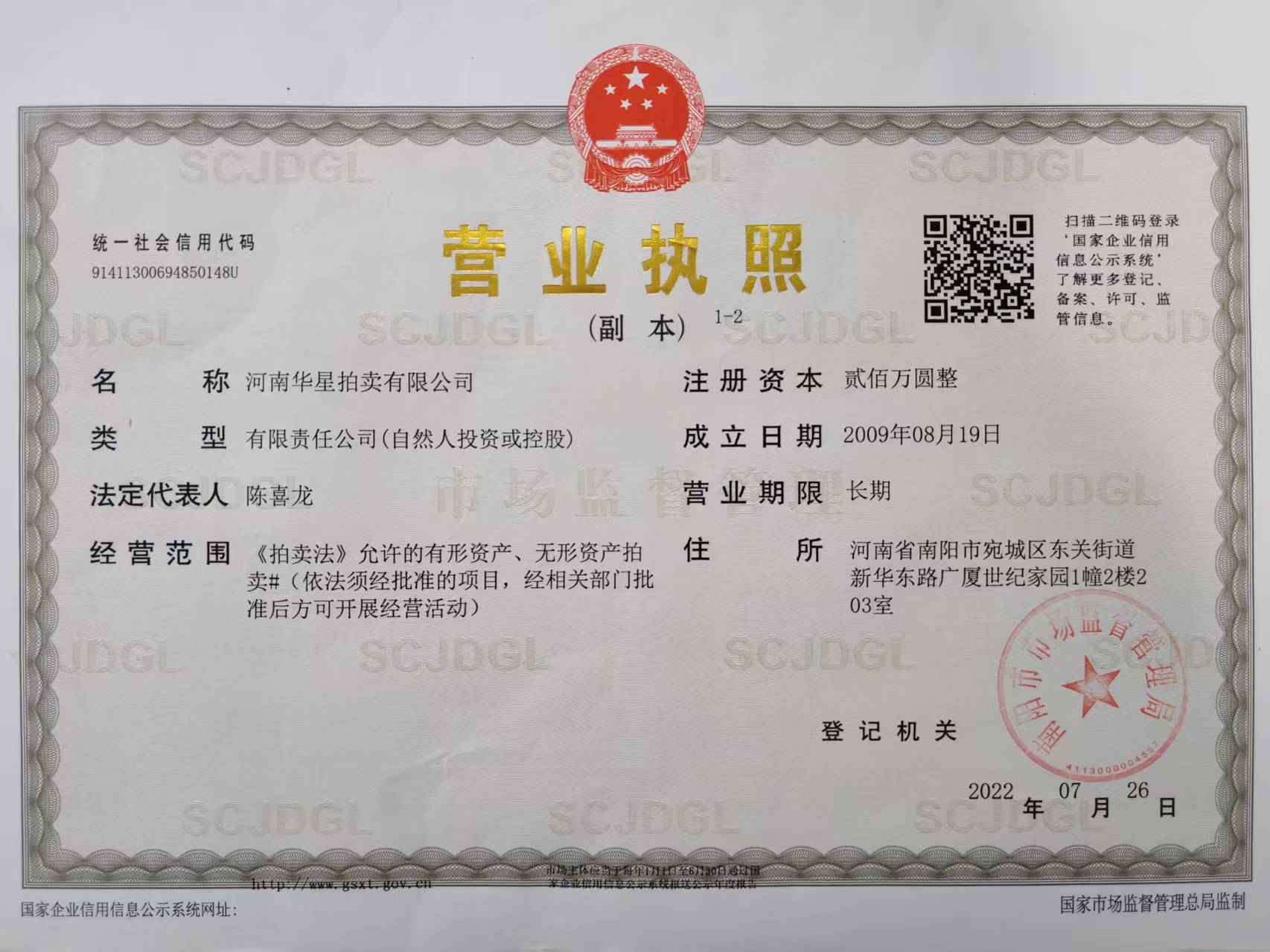 2013年7月取得南陽市人民政府指定、河南省財政廳頒發(fā)河南省公物拍賣資格證書